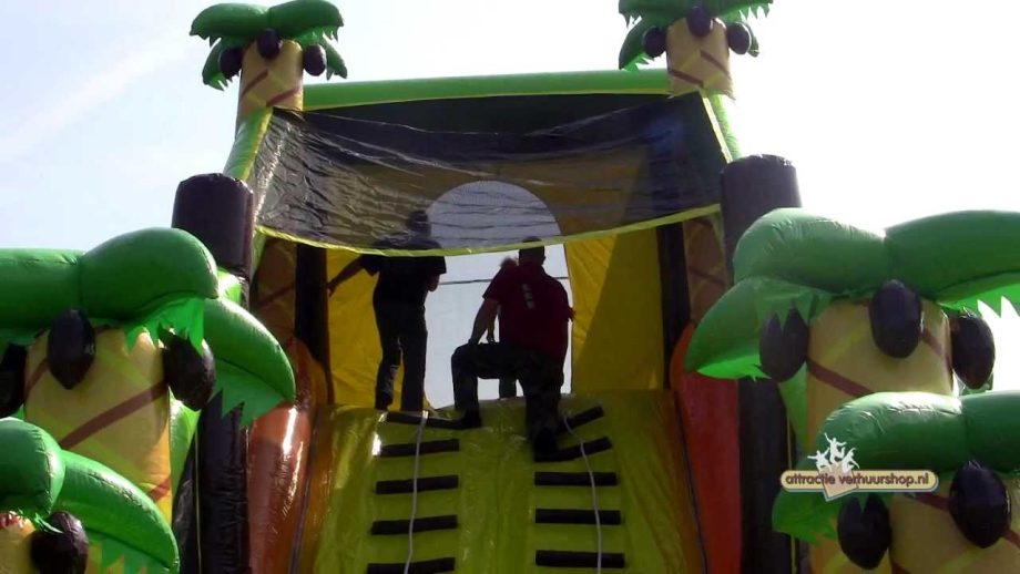 Wie durft deze 4 meter hoge opblaasbare Jungle berg te beklimmen om vervolgens in een vrije val naar beneden te springen? Vanaf de grond lijkt dit misschien niet zo hoog, maar als je er eenmaal boven staat moet je toch echt even slikken voordat je durft te springen. Gelukkig zorgt het opblaas kussen voor een zachte en veilige val.